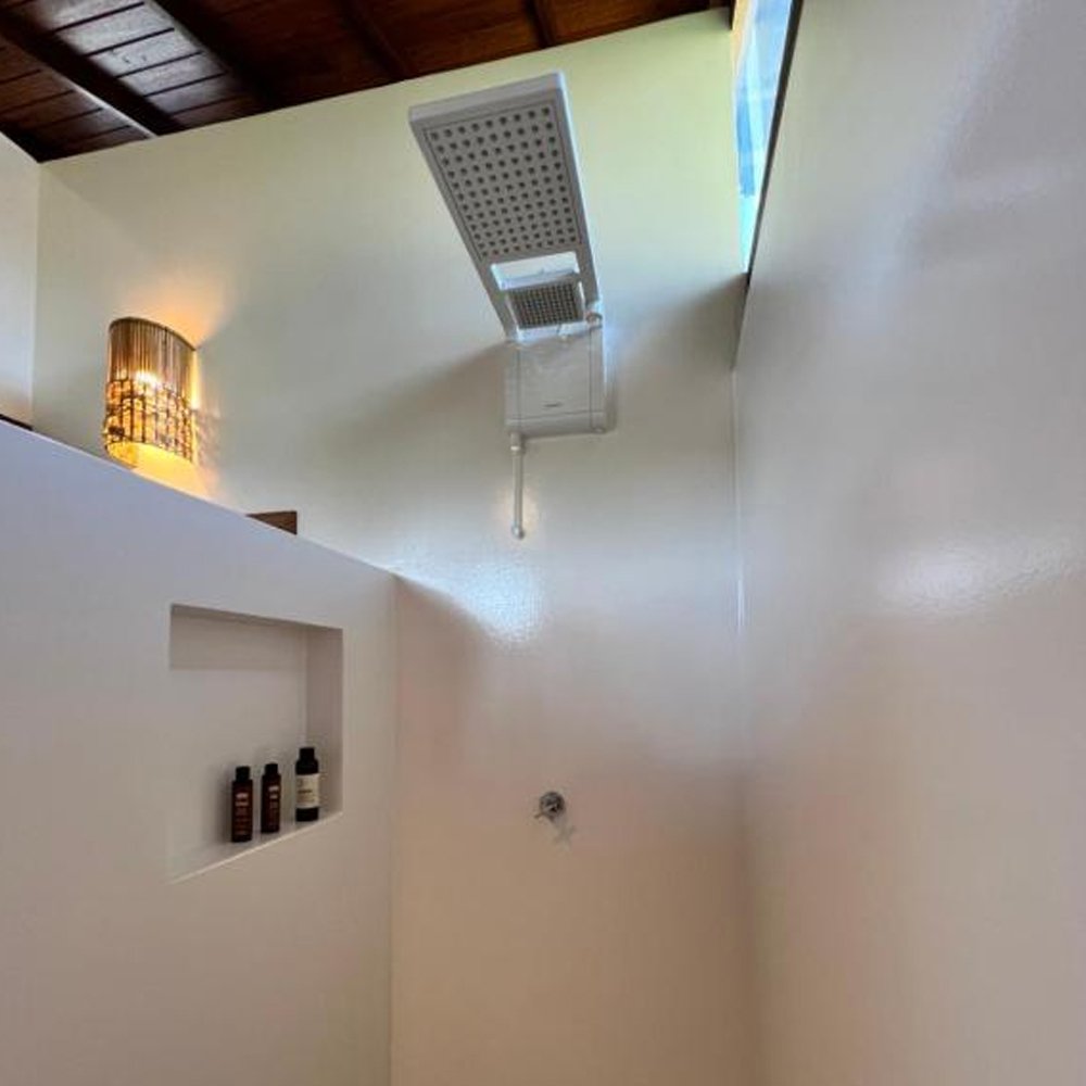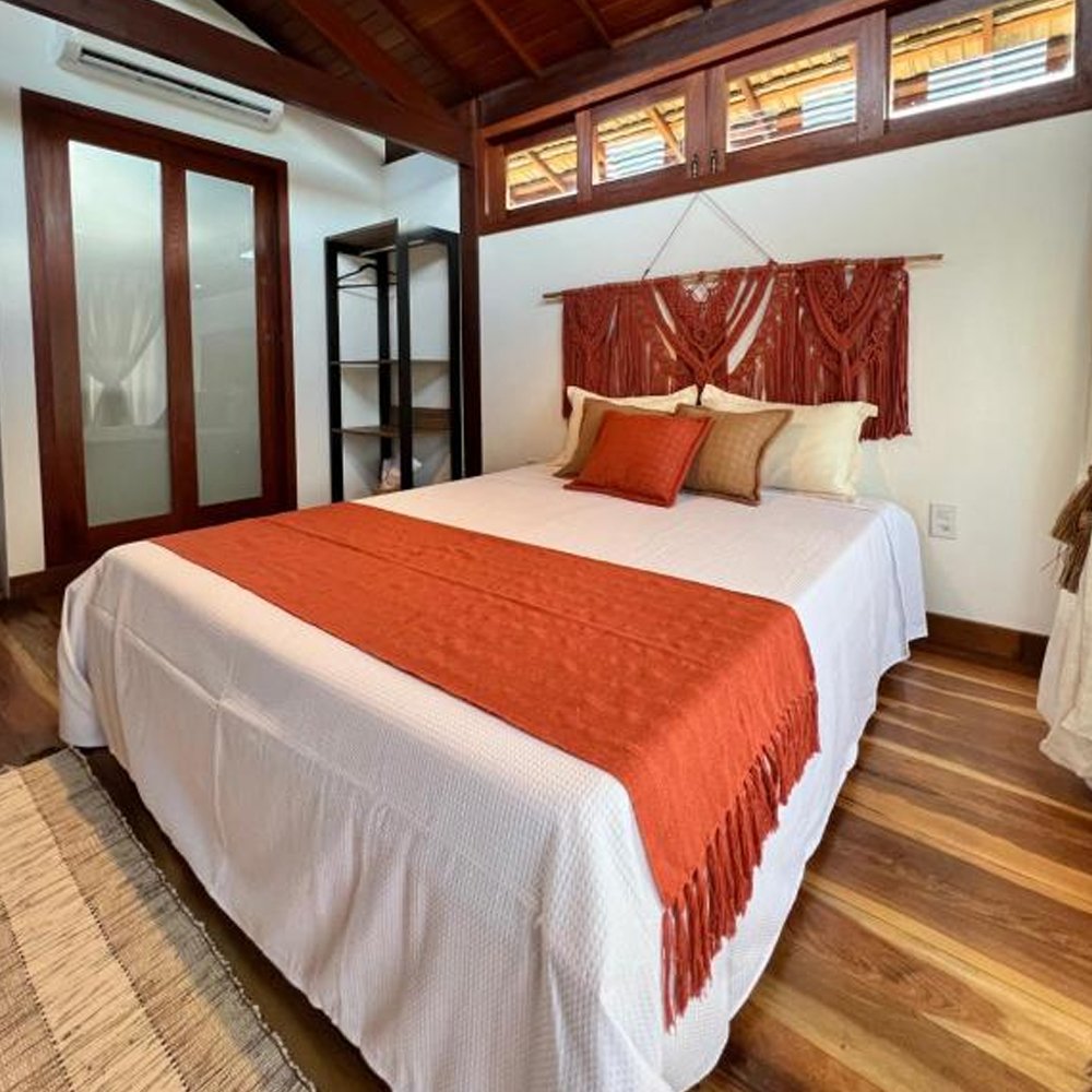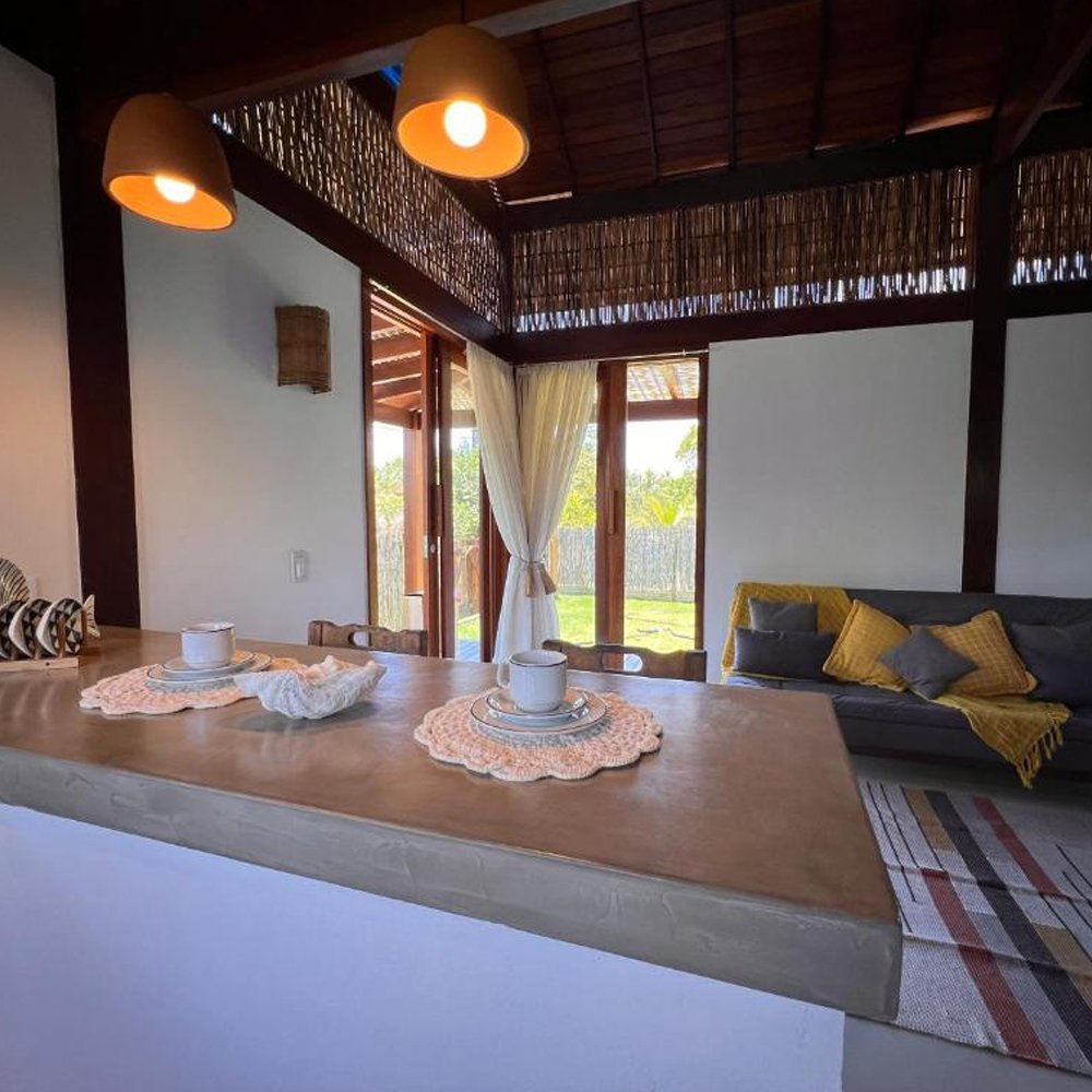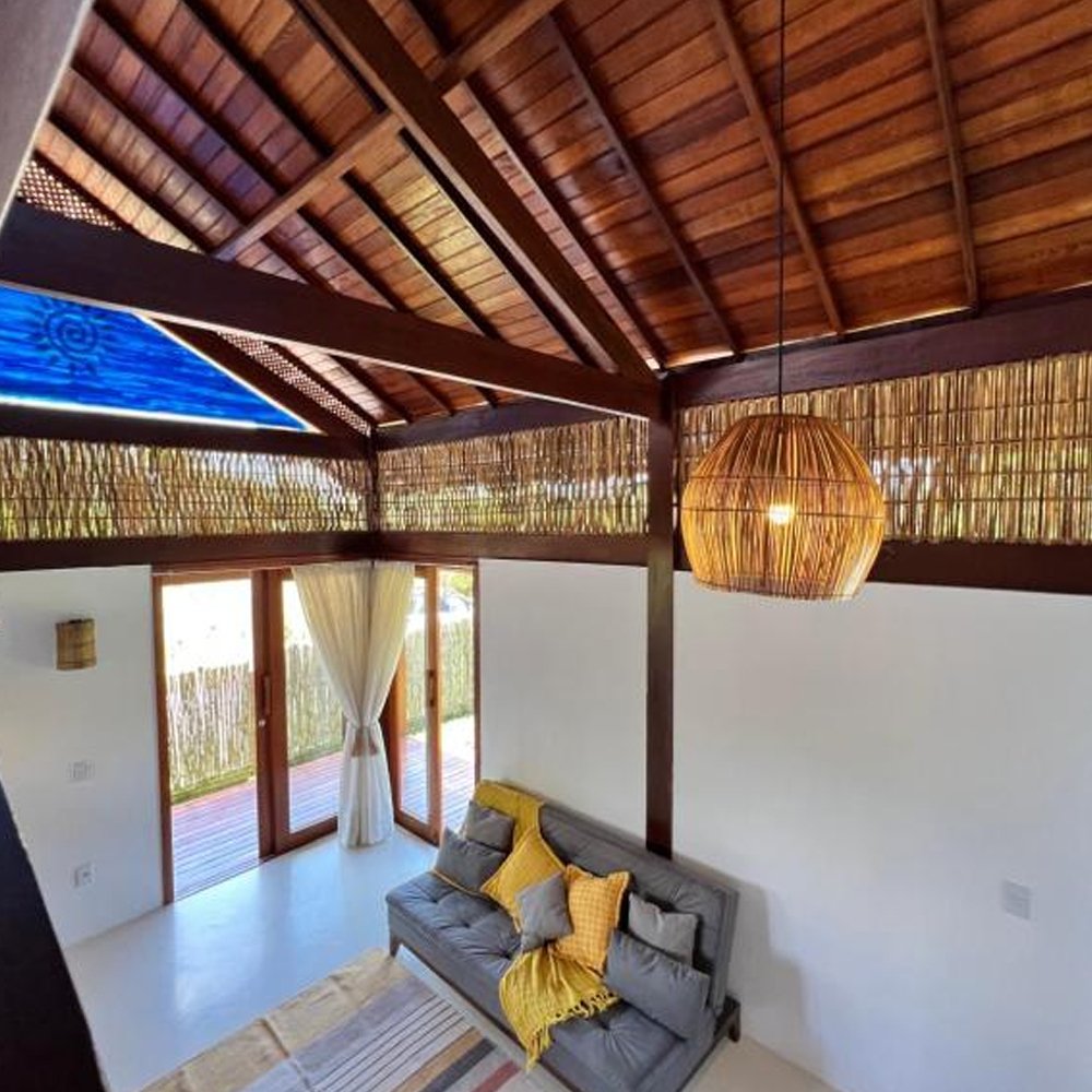 Bangalô climatizado com 50 m², 1 quarto, 2 banheiros com chuveiro e 1 sala de estar.