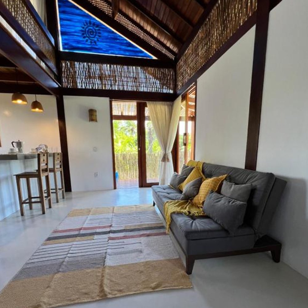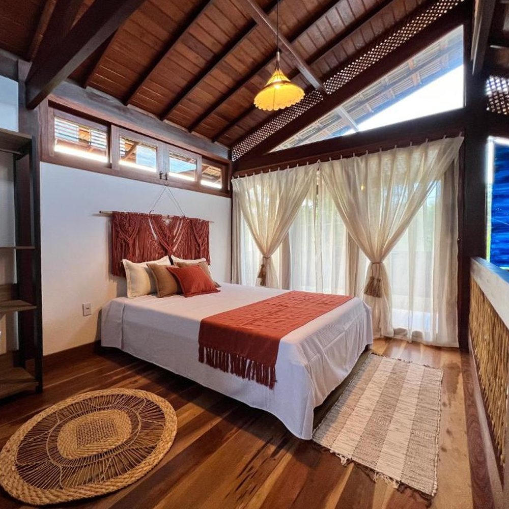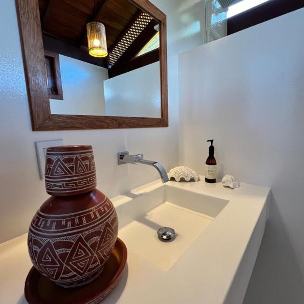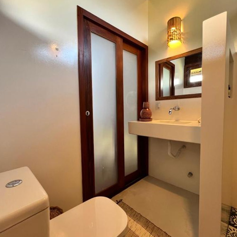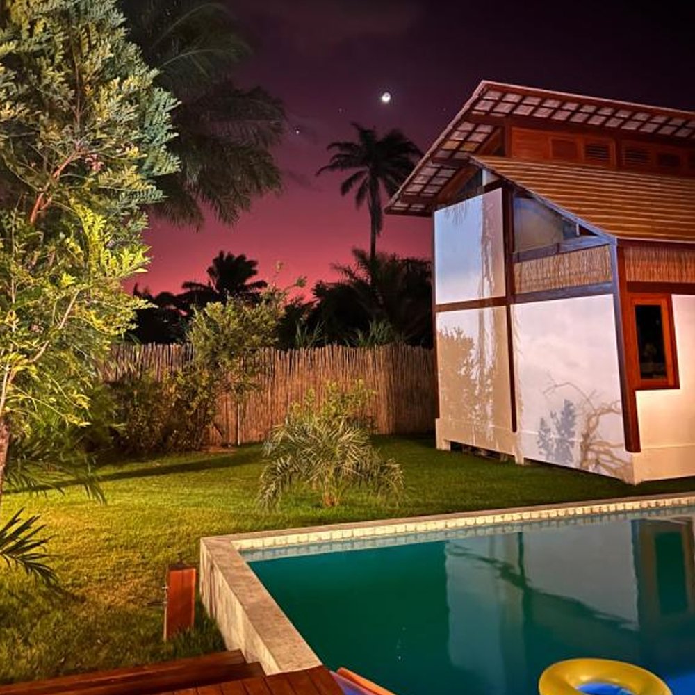 Bangalô climatizado com 50 m², 1 quarto, 2 banheiros com chuveiro e 1 sala de estar.