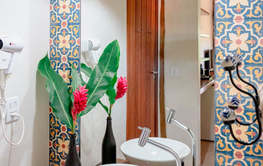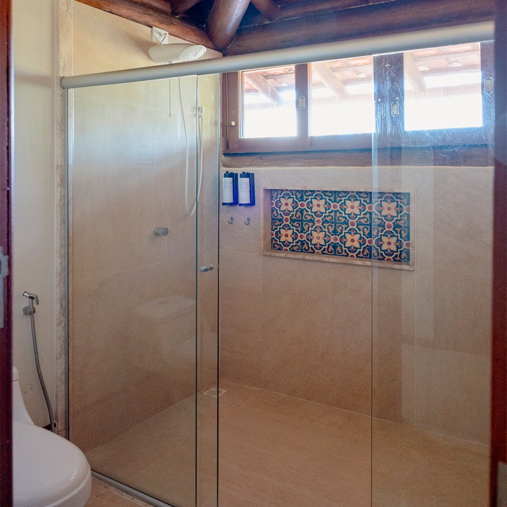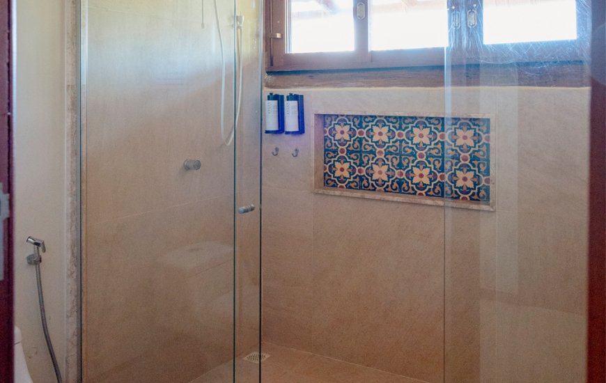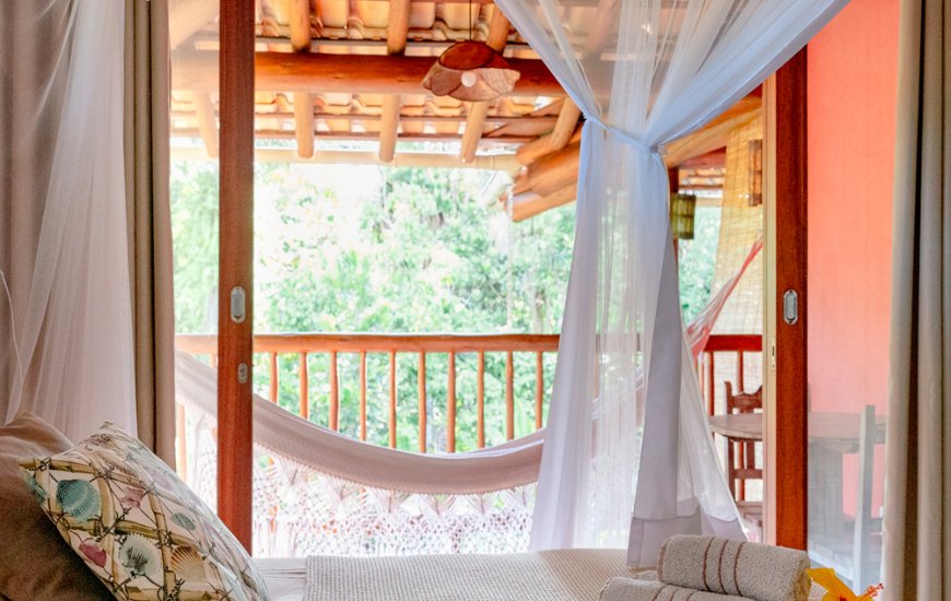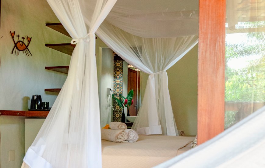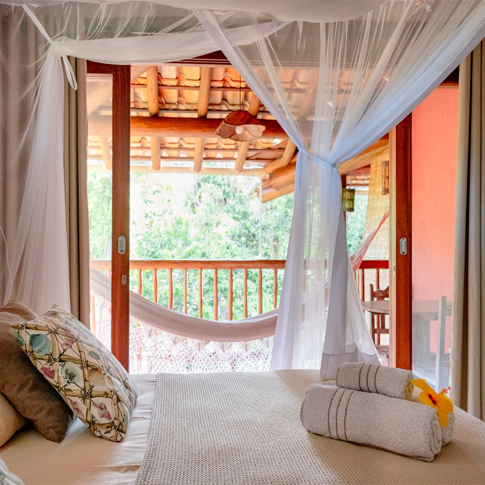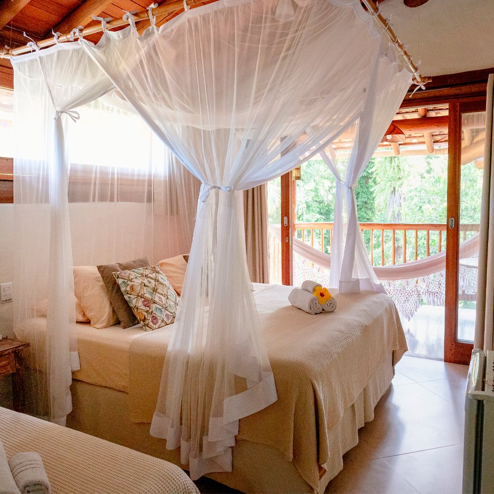 Cama box, colchão super king (2,03m x 1,93m), lençóis e toalhas 100% algodão, frigobar, TV LED 32 polegadas, canais Oi TV, internet wi-fi, ar-condicionado split, cortinas blackout, ventilador de teto e tela mosquiteiro nas portas.
