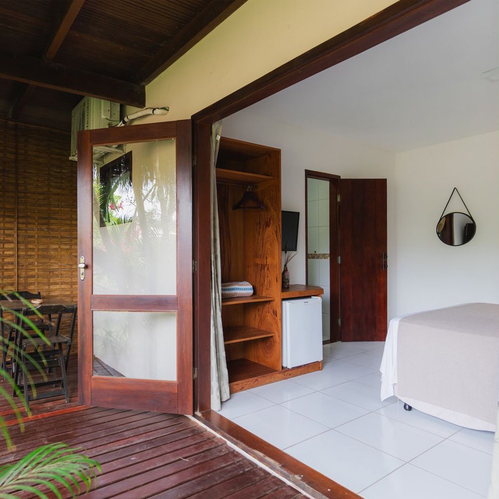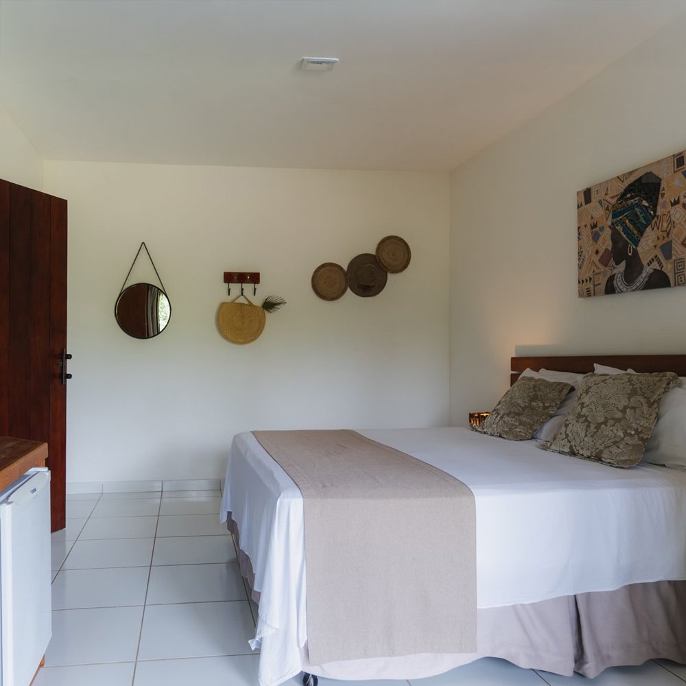 A Suíte Econômica é um convite ao descanso simples e acolhedor. Localizada no térreo, com 17m² bem distribuídos, ela acomoda confortavelmente até 2 pessoas em uma cama queen size envolta por uma atmosfera tranquila.