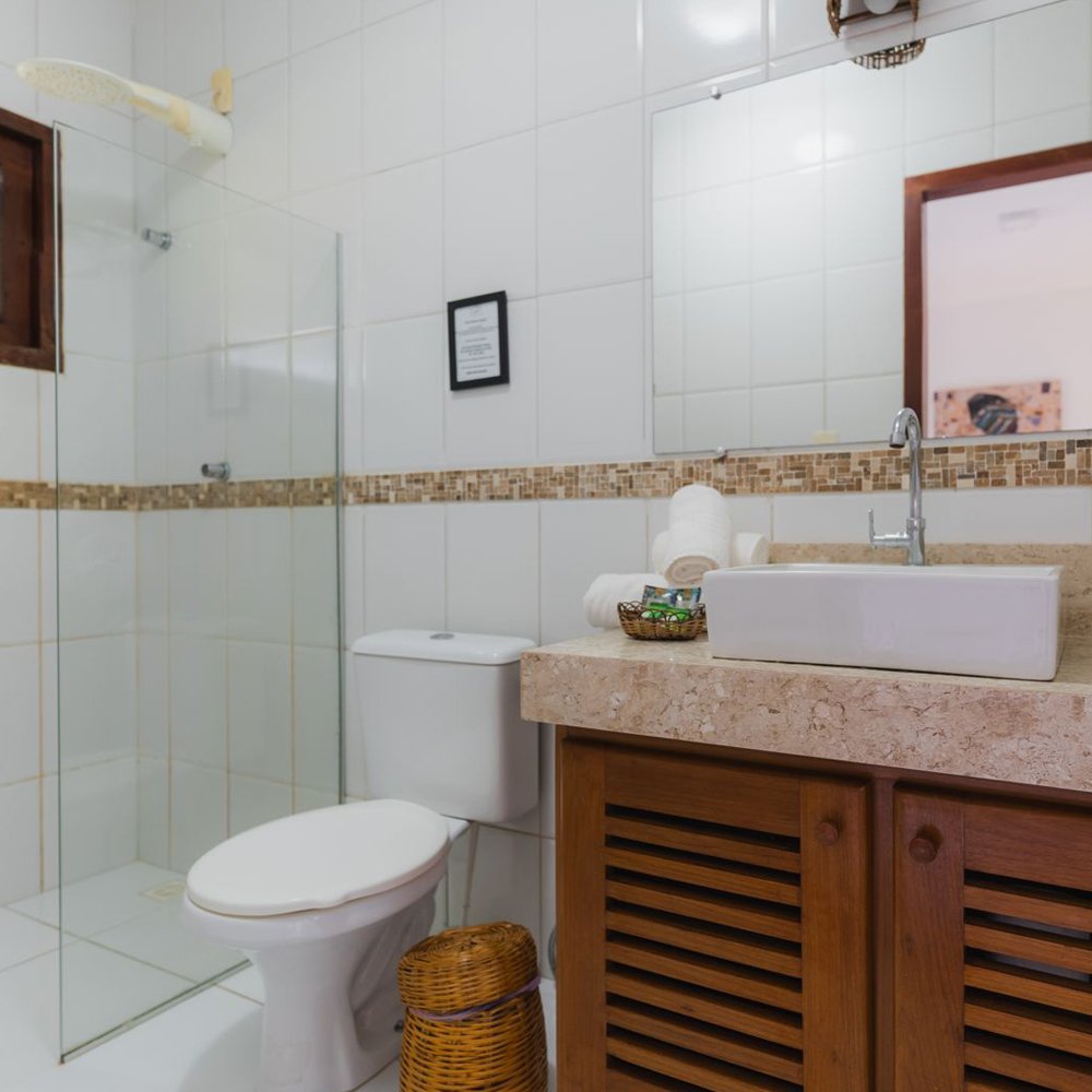 O banheiro privativo é funcional e charmoso, ideal para recarregar suas energias depois de um dia entre a mata e o mar.
