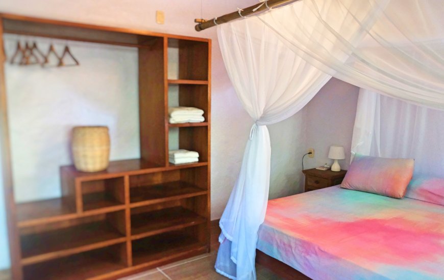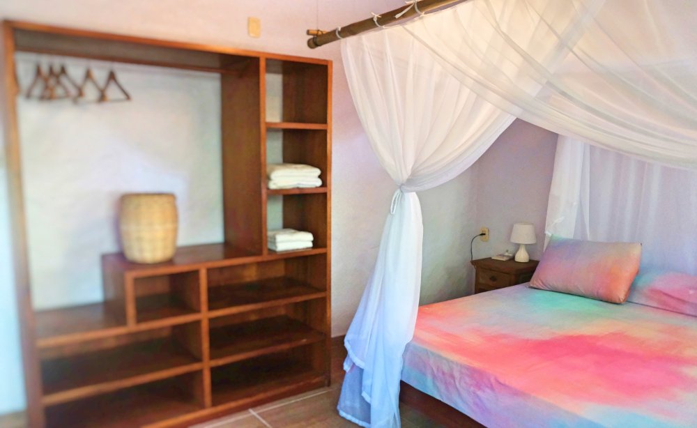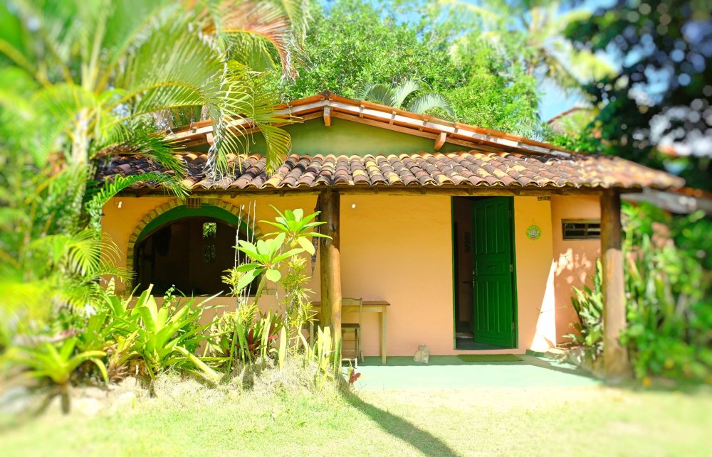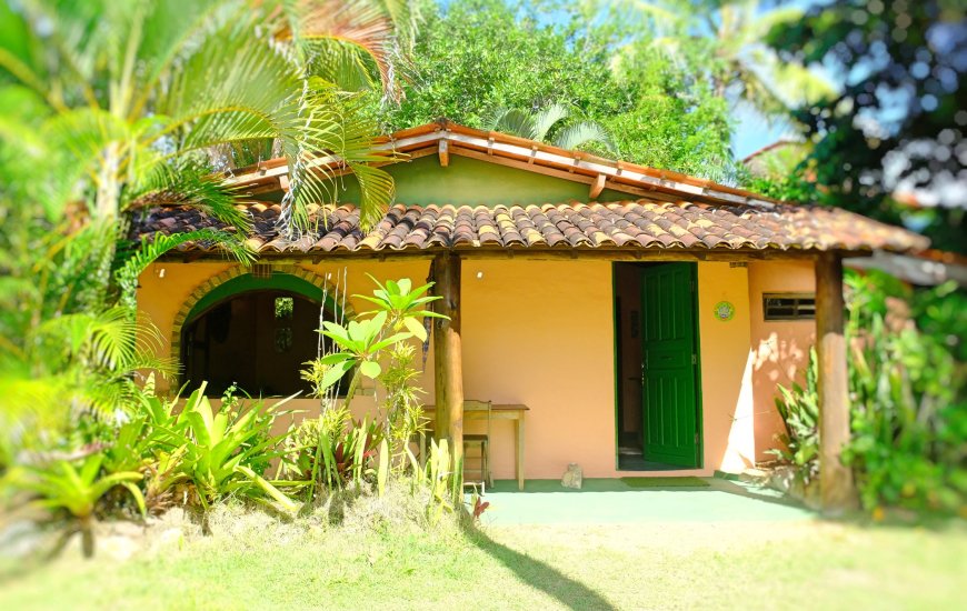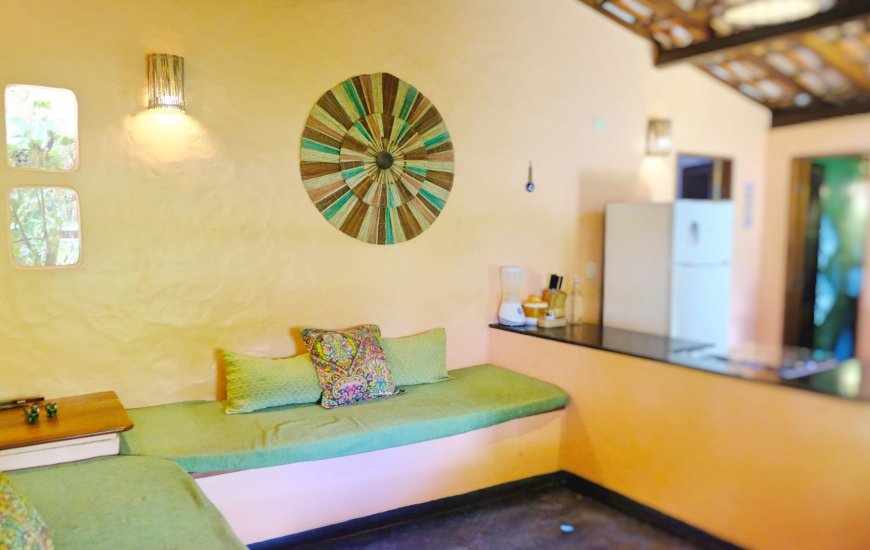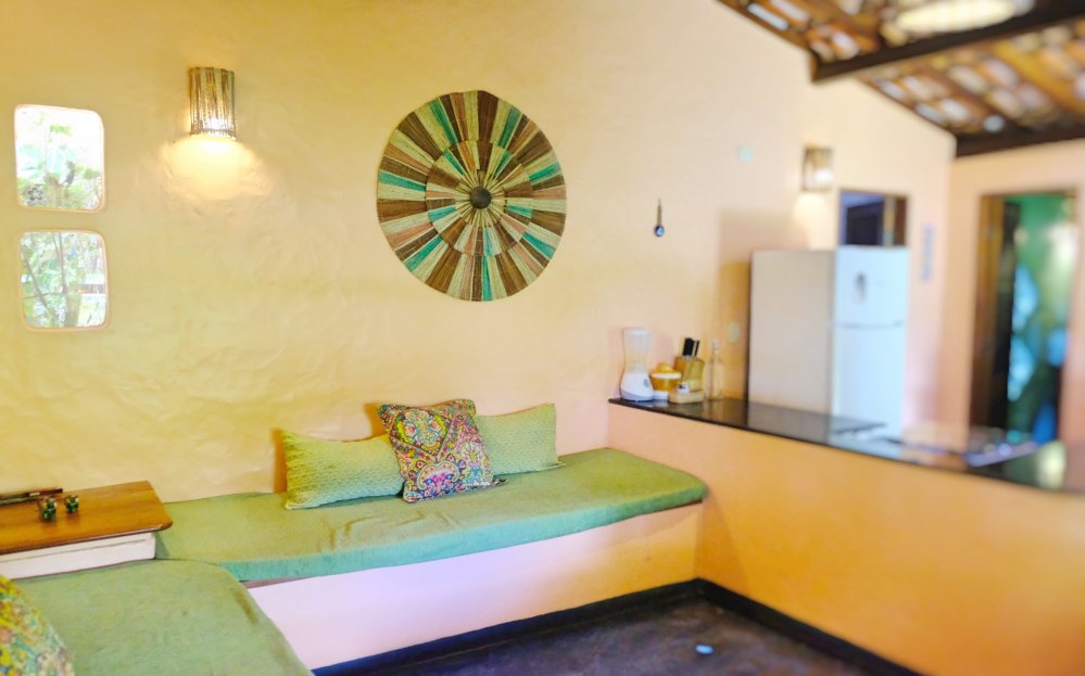 Charmosa casa independente com um quarto muito espaçoso, com cama king e cama de solteiro, com ar condicionado. Sala com dois sofás-cama de alvenaria, cozinha americana integrada e totalmente equipada (geladeira, fogão, liquidificador, louça...), ventilador, bonito banheiro e varanda com rede.