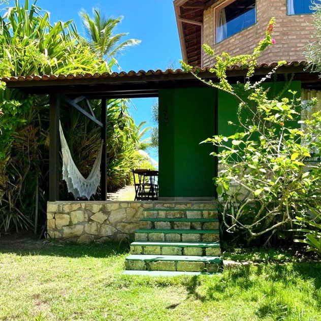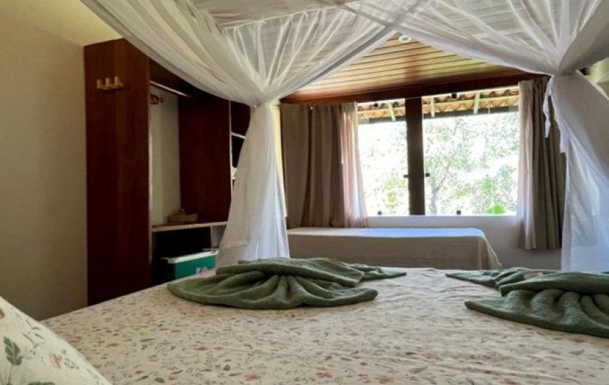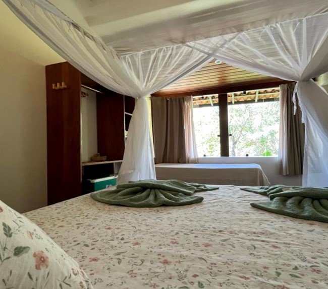 Linda e espaçosa suíte, com cama king e cama de solteiro, ou 3 camas de solteiro, ar condicionado, frigobar, varanda e rede.