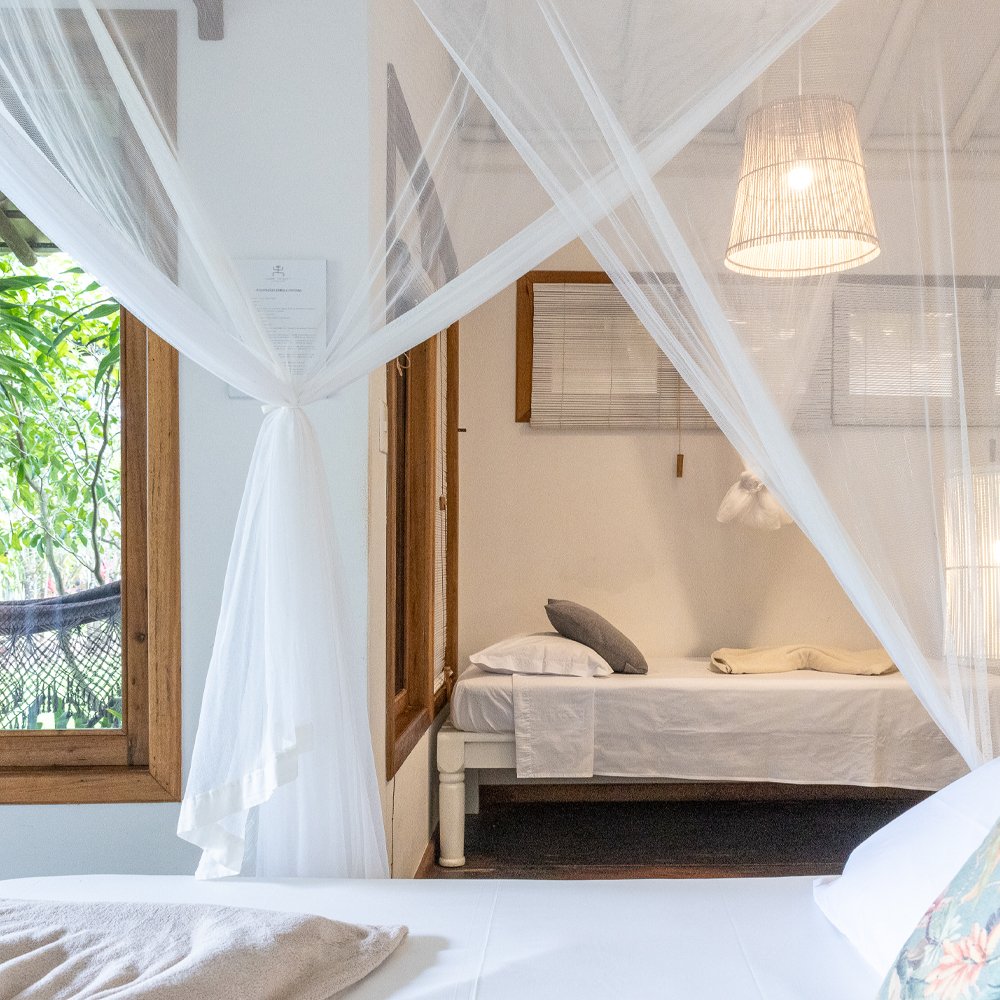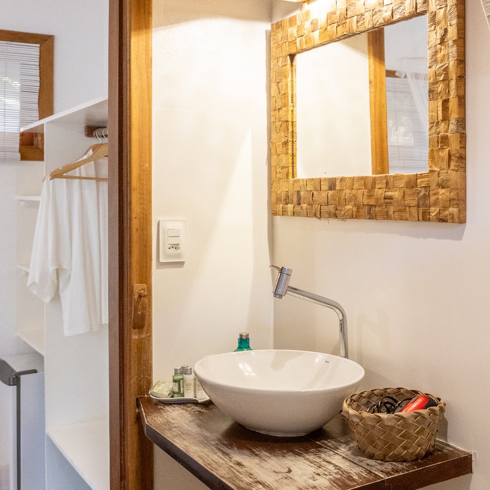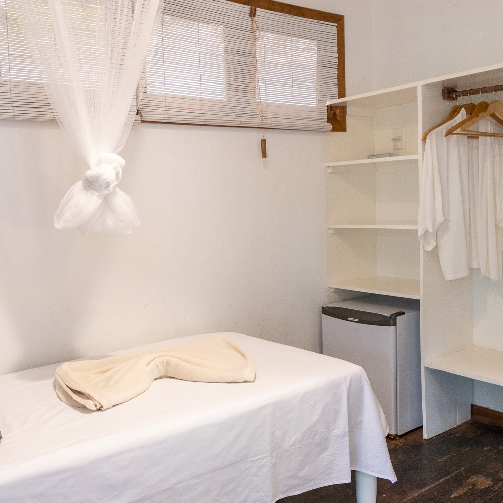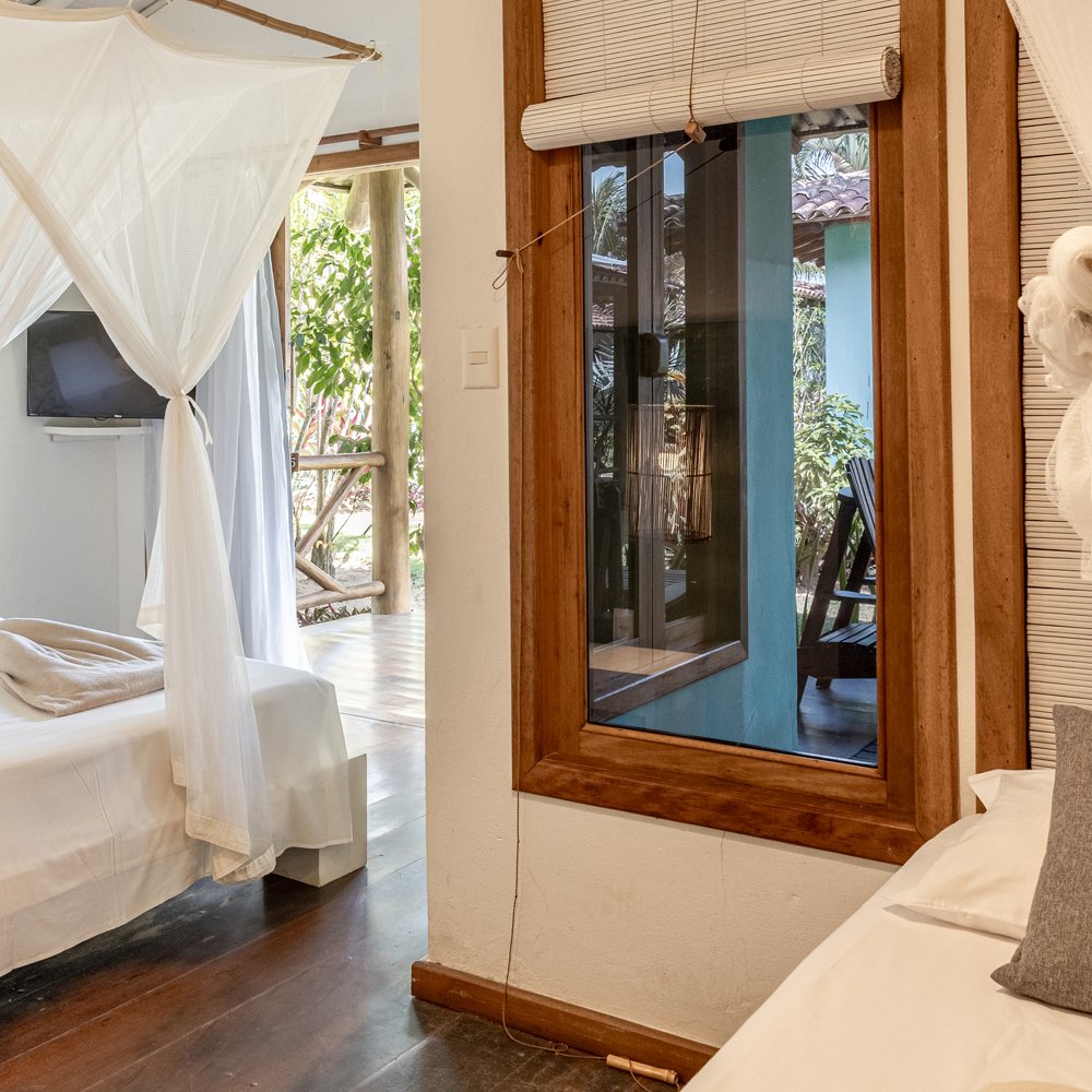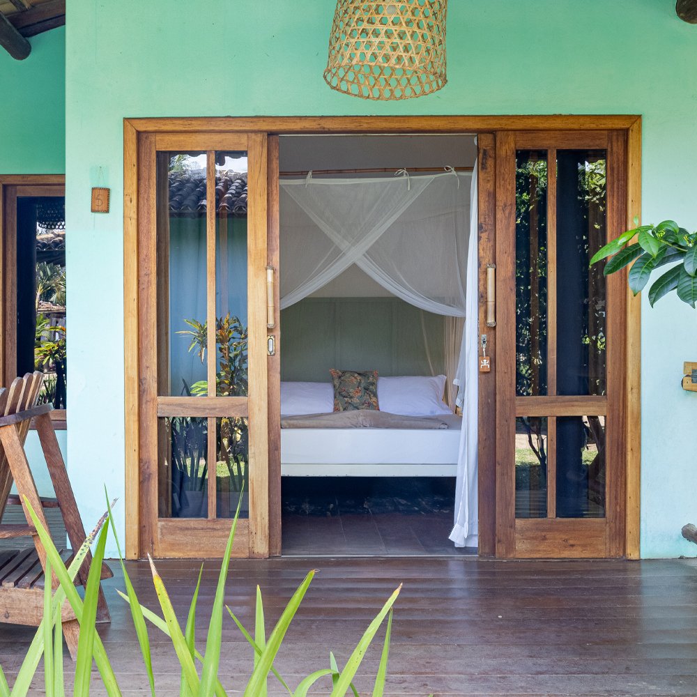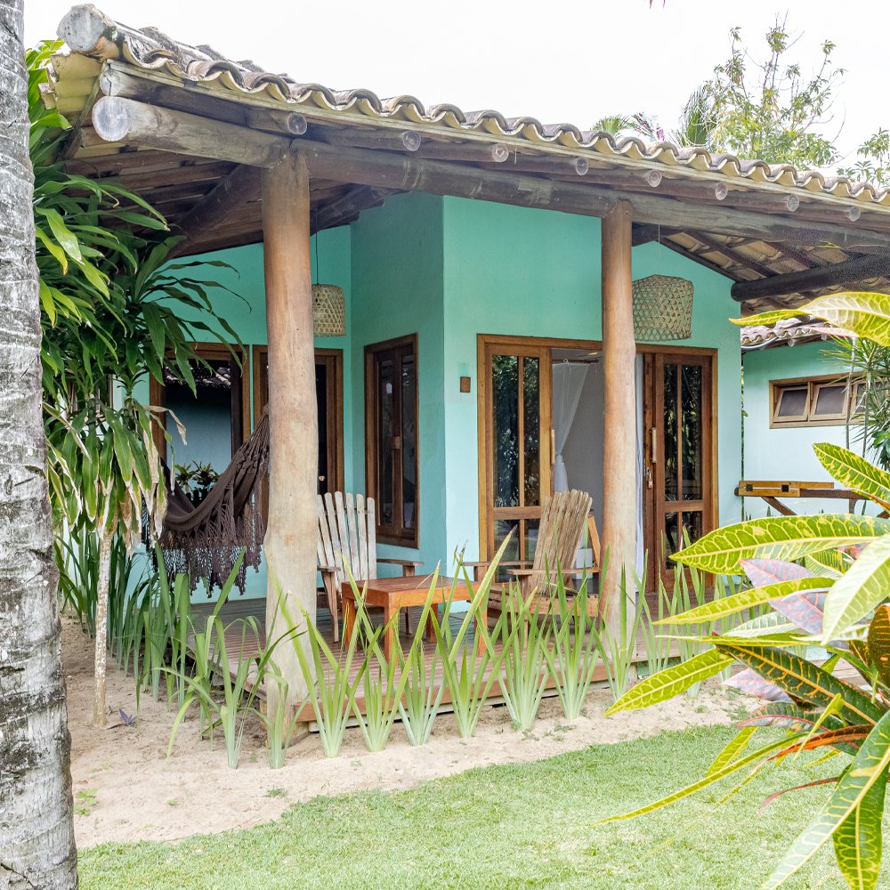O Bangalô Térreo possui decoração rústica com charme tropical, varanda com rede e um ambiente acolhedor cercado pela natureza.