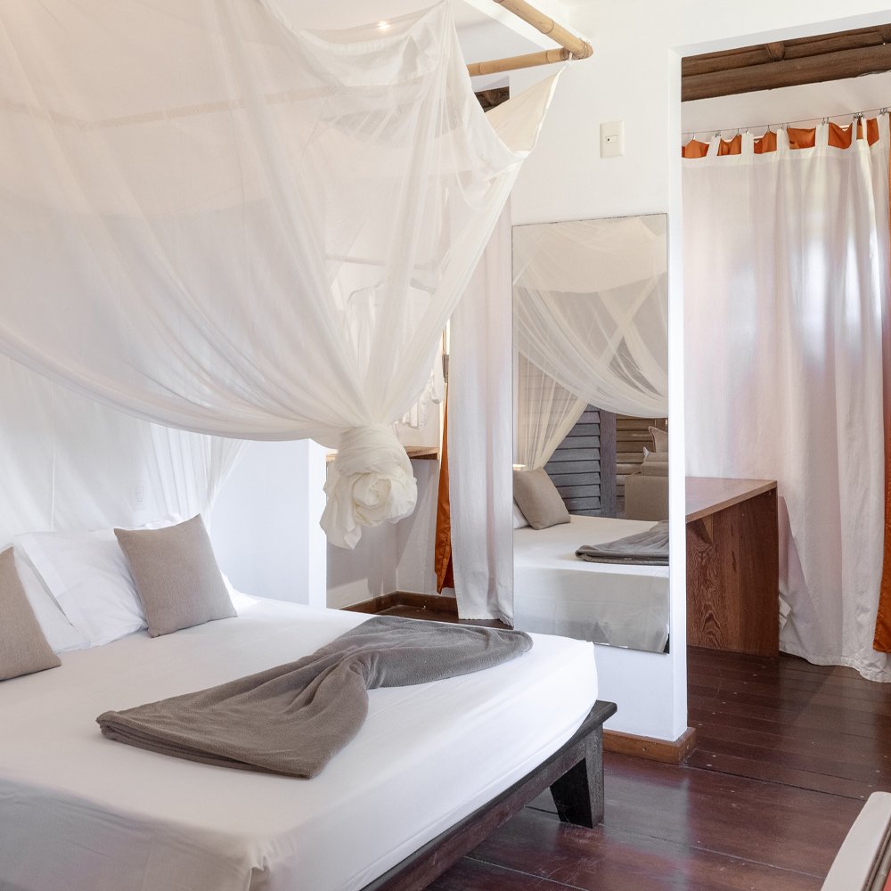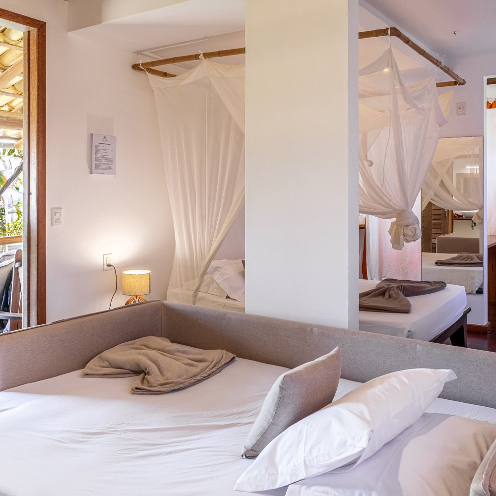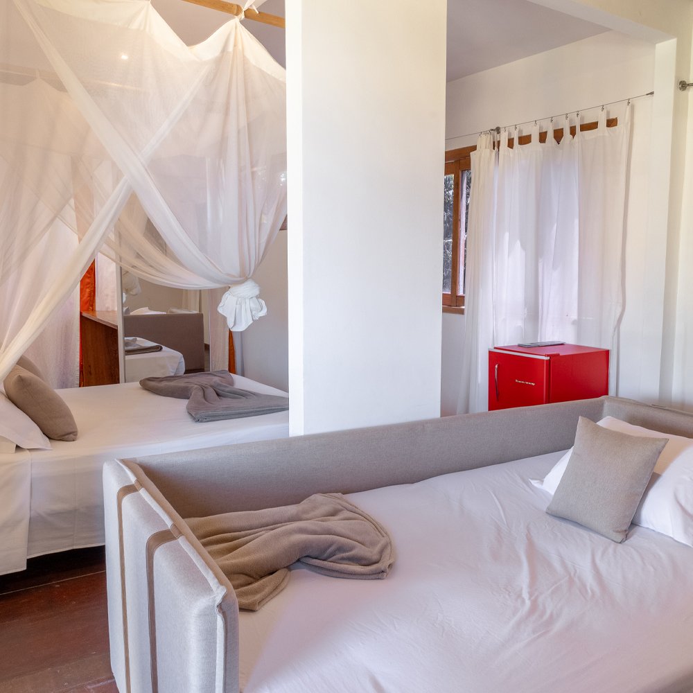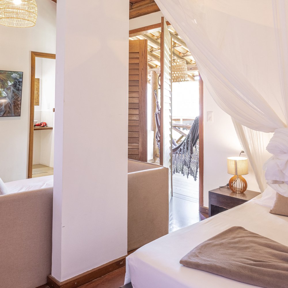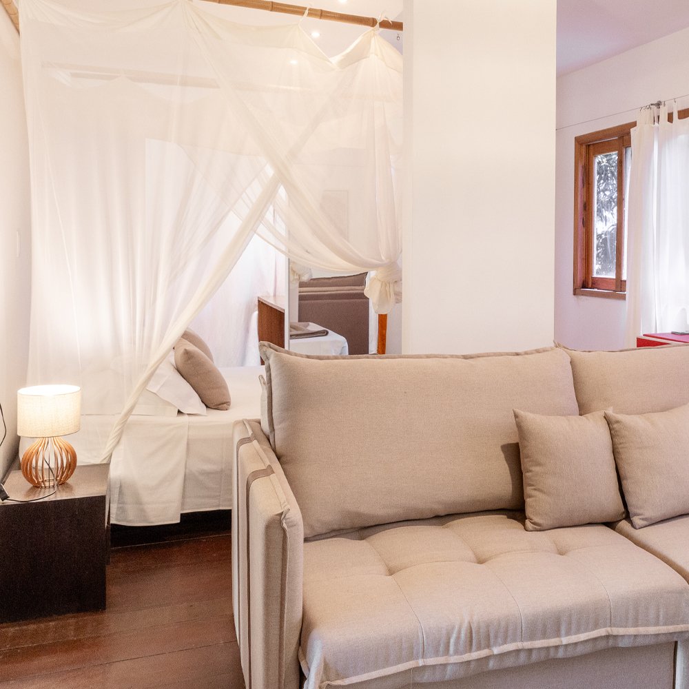 A Suíte Andar Superior é um ambiente único, localizada no segundo andar e conta com uma cama de casal e sofá-cama que pode ser convertido em cama de casal.