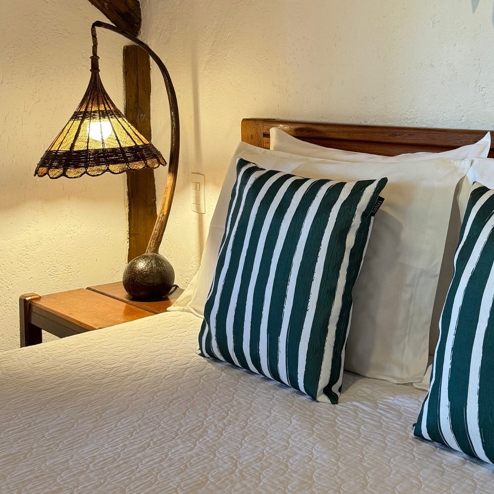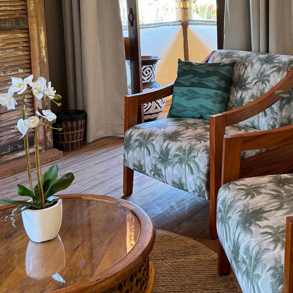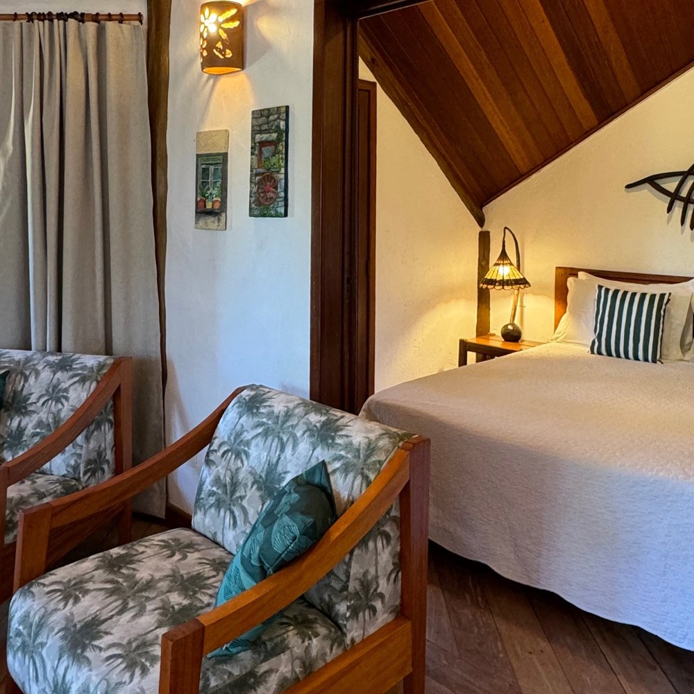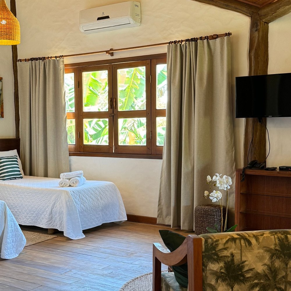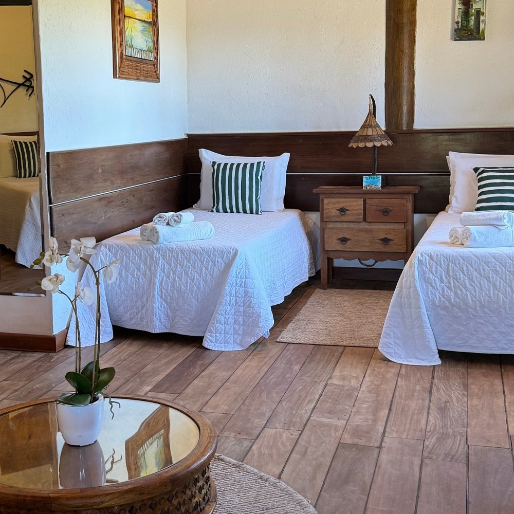 Apartamento localizado no andar superior da cabana de piaçava, dispondo de um quarto com cama de casal, uma sala com duas camas de solteiro e varanda com vista frontal do mar. Inspirada na arquitetura da região, a Suite Cabana mistura elementos rústicos e naturais e foi cuidadosamente projetada para acolher casais ou famílias.