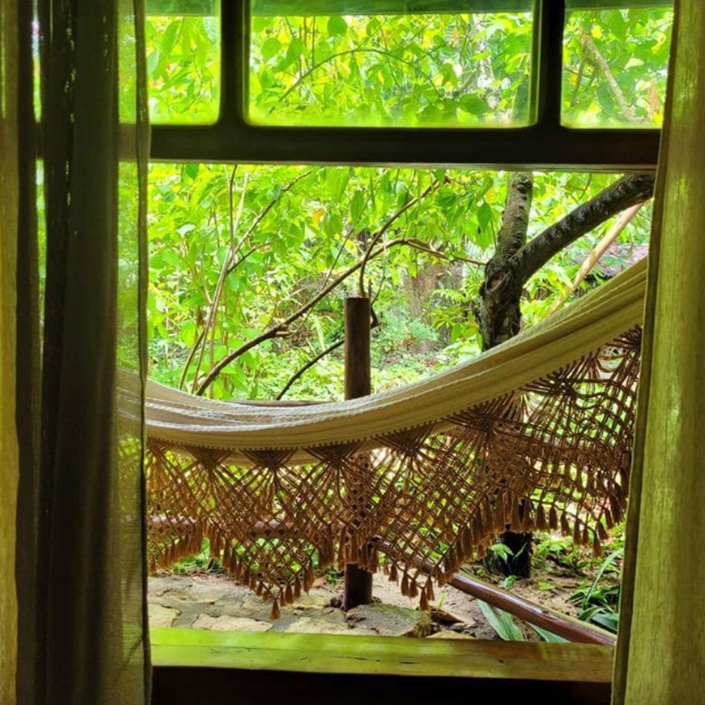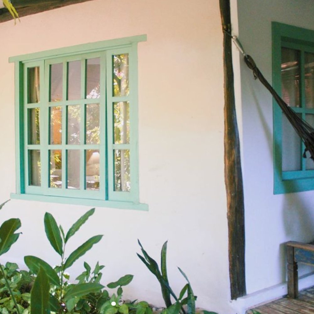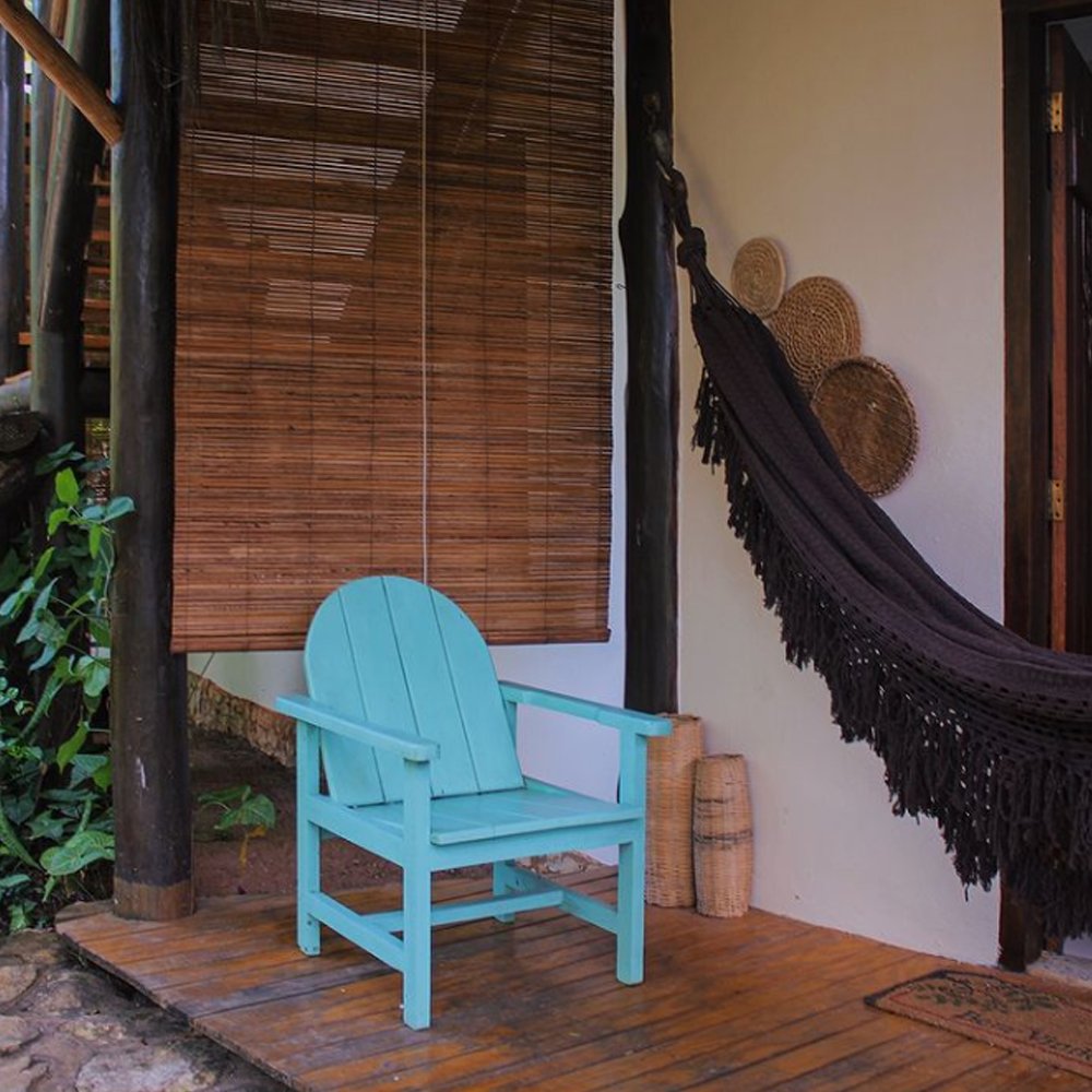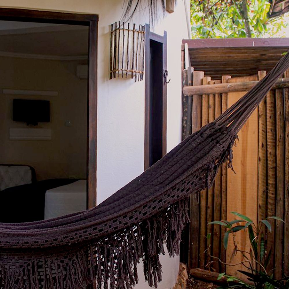 Todos os apartamentos têm varanda individual com rede e eles se encontram em volta da Fruta Pão centenário.